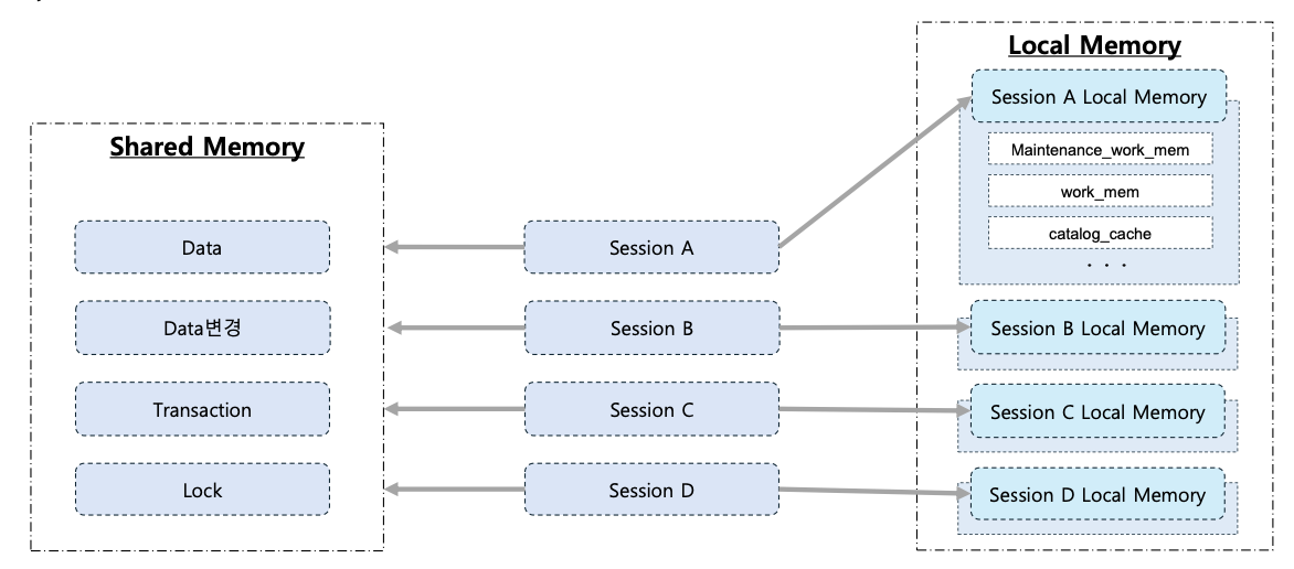 - 참고 : 클라이언트가 데이터베이스 접속요청 시, Backend 프로세스를 위한 Local Memory를 할당한다.