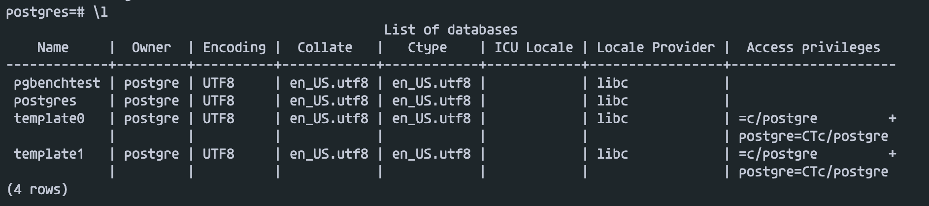 # psql -U postgre -d postgres CREATE DATABASE pgbenchtest; \l