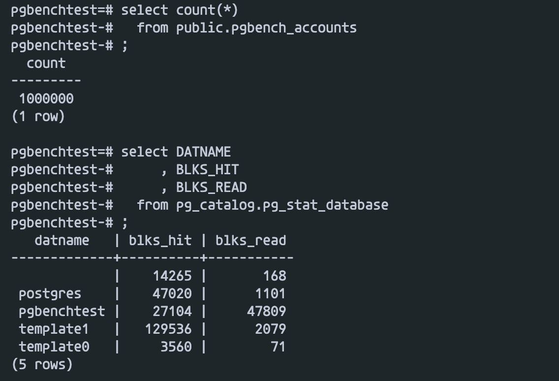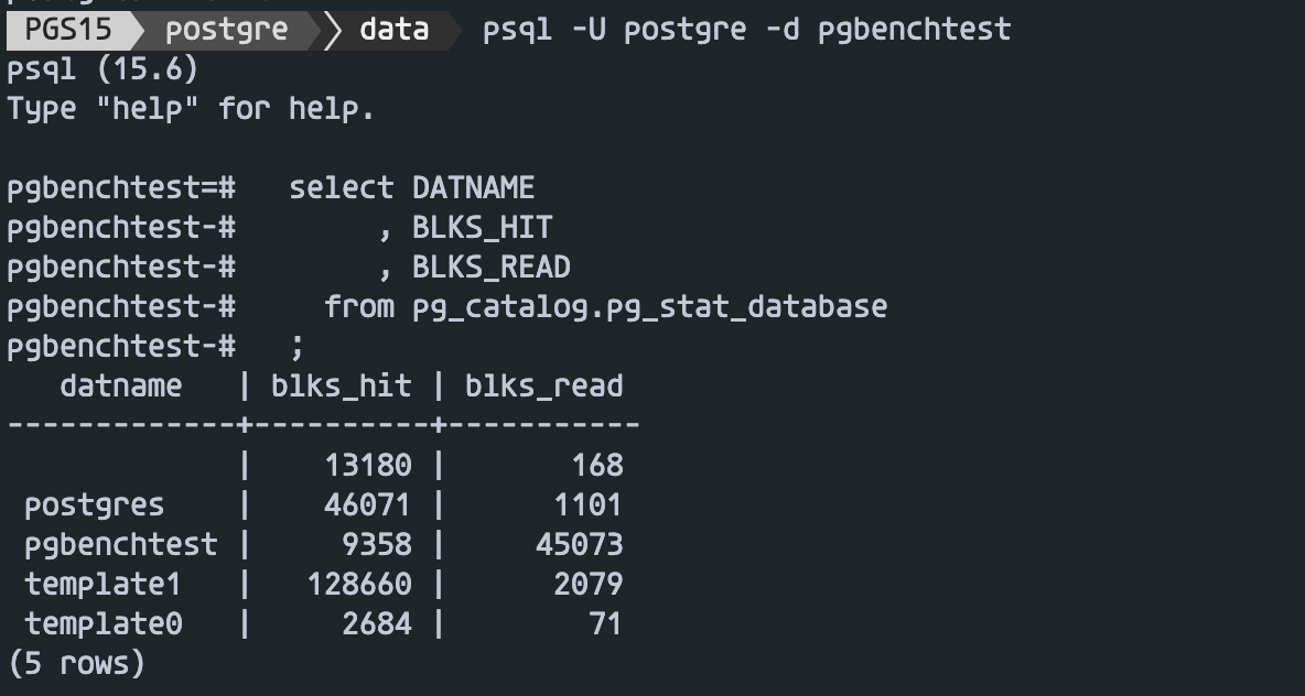 # postgre 접속 및 Shared_buffers 사용 확인 psql -U postgre -d pgbenchtest select DATNAME , BLKS_HIT , BLKS_READ from pg_catalog.pg_stat_database ;