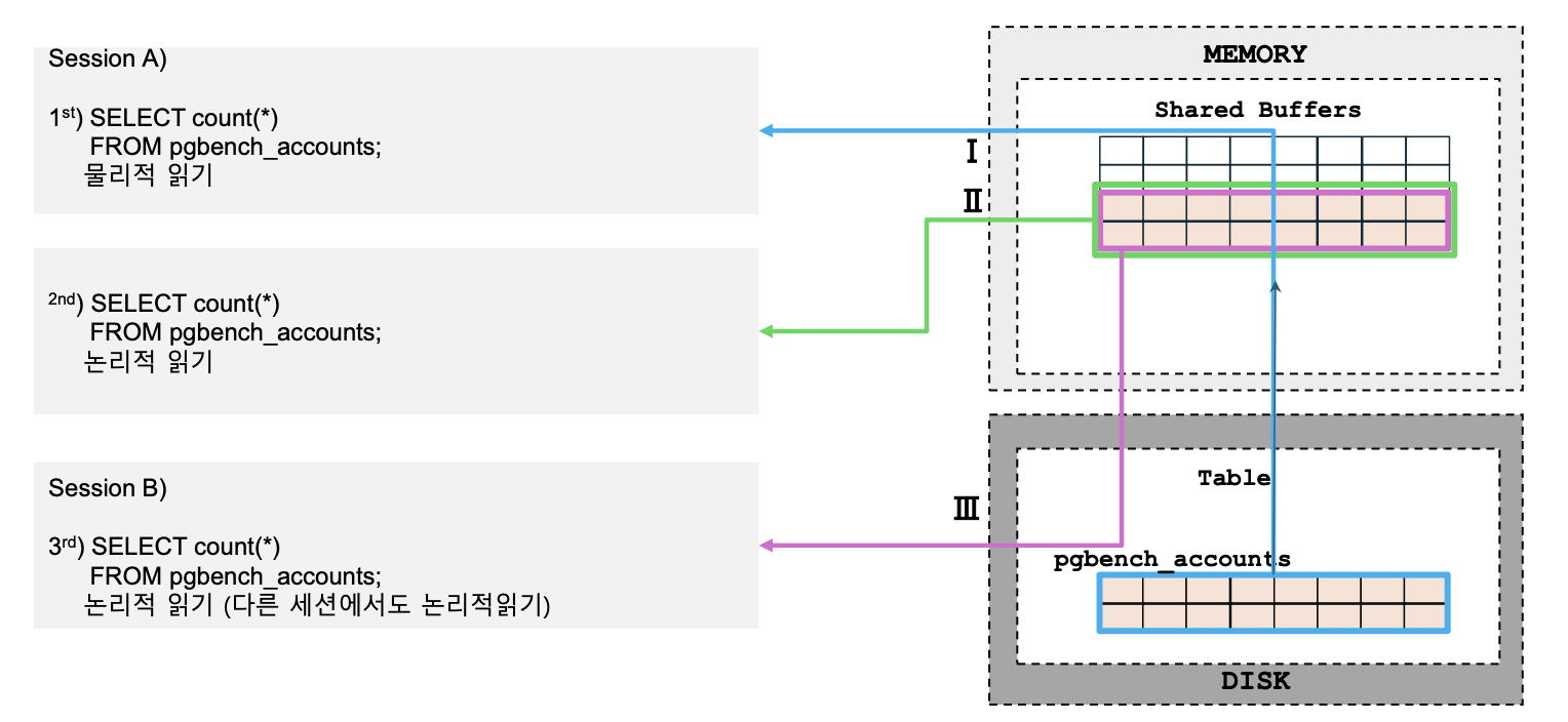 - 동일/다른 세션에 상관없이, 요청한 데이터가 shared buffers에 존재할 경우,