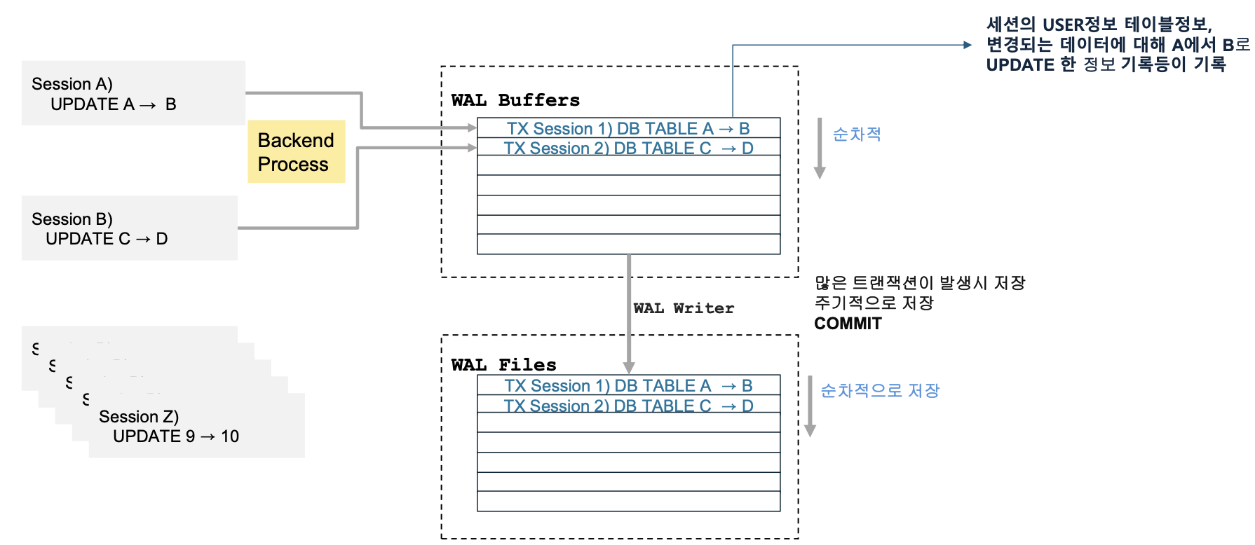 - Wal Buffers는 Client로 부터 요청된 변경된 데이터와 트랜잭션 정보를 저장